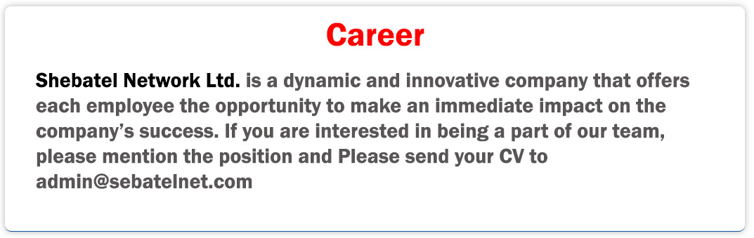 Shebatel Network Ltd is connected with SEA-ME-WE-4 submarine cable.Sebatel offers IT Consultancy to different ISP, IT Companies & Corporate user for IT related problems and solutions.